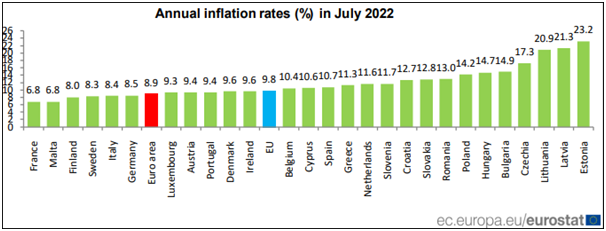 Cu o inflație anualizată de aproape 10%, Uniunea Europeană este pe punctul de a marca mari mișcări sociale, cauzate de scăderea puterii de cumpărare. Unele națiuni, în primul rând balticii, angrenați destul de activ în sprijinirea Kievului, au ajuns la rate ale inflației de peste 20%: