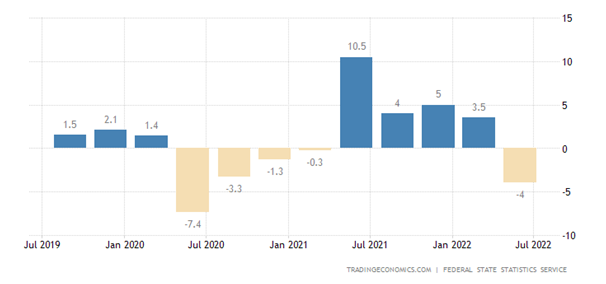 Și ajungem la Federația Rusă, agresorul din acest război. Aici avem o recesiune în curs de producere, estimată de către guvern în jur de 4%. Mai precis se așteaptă o scădere de -4,2% la finalul anului. Deocamdată am marcat o scăderea anualizată de 4% după trimestrul al II-lea.