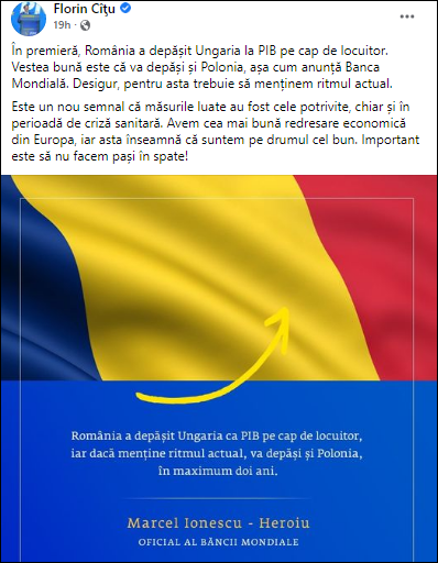 Prima observație pe care ar fi făcut-o orice om onest ar fi aceea că generos-cu-guvernul clujean Marcel Ionescu-Heroiu ar fi avut obligația să fie ceva mai puțin imprecis decât a fost și să ne indice despre ce fel de PIB/locuitor este vorba: cel nominal sau cel care ține cont de puterea de cumpărare. A doua observație ține totuși de decența de a vorbi despre datele anului 2021 cel puțin după ce se încheie anul 2021.