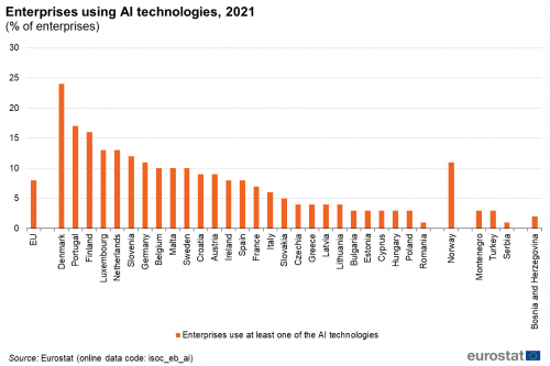 În fine, suntem tot ultimii și la ponderea companiilor care utilizează tehnologii de inteligență artificială (AI-artificial intelligence):