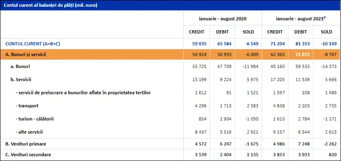 De la 1 ianuarie 2021 până la 31 august 2021, România a contribuit cu mai bine de 10 miliarde de euro la revenirea economică a altor state. Cam atât au cheltuit românii în plus față de ceea ce au încasat de afară. Mai simplu spus, noi am plătit în străinătate 81,35 miliarde de euro, în vreme ce străinii au plătit aici doar 71,2 miliarde de euro. Am rămas, așadar, cu un gol de peste 10 miliarde de euro, ne informează Banca Națională: