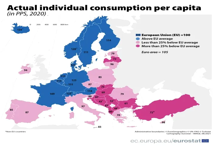 Cu ocazia zilei de 9 mai s-au spus foarte multe lucruri despre Uniunea Europeană și despre evoluția României. Dar cel mai „cinstit” mod de a caracteriza evoluția țării noastre în interiorul blocului continental este să ne comparăm cu evoluția celorlalte state. Și să ne raportăm la media europeană. Din acest punct de vedere, nota care poate fi acordată global unei țări pentru performanța economică se numește PIB/locuitor, metodologia PPS (purchasing power standards – la standardul puterii de cumpărare). Urmărind acest indicator o să găsim, în anul 2021, România pe locul 22 din UE, la 73% din media Uniunii.