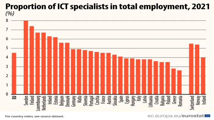 Iar educația insuficientă aduce după sine lipsa forței de muncă bine plătite. Suntem, așadar, și ultima națiune europeană ca pondere a celor din industria IT&C, bine plătită, în totalul forței de muncă: