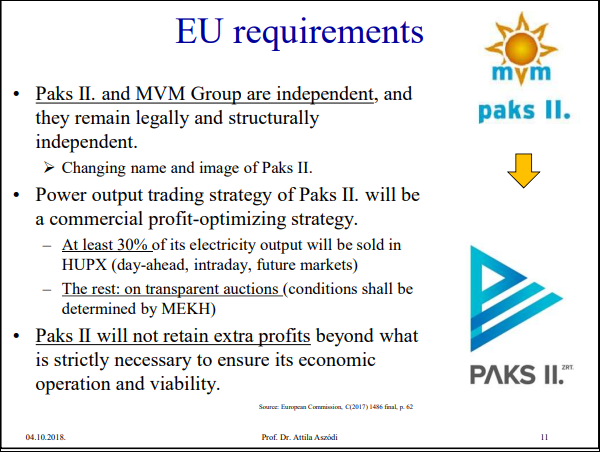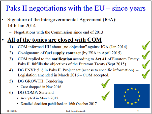 Orban a numit un reputat specialist, prof. dr. Attila Aszódi, în funcția de secretar de stat responsabil cu acest proiect. Și acesta și-a luat rolul foarte în serios, conducând un proces lung și complicat de obținere a acordurilor de mediu din partea țărilor vecine, plus aprobarea Comisiei Europene pentru acest ajutor de stat gigantic (peste 10 miliarde de euro), în condițiile unei atribuiri fără licitație a unui contract colosal unei firme rusești (din afara Uniunii Europene). De menționat că maghiarii au obținut aprobarea Comisiei Europene asupra acestui contract care încalcă toate regulile Uniunii Europene privind concurența în plină epocă a sancțiunilor impuse Rusiei după anexarea Crimeii în 2014!