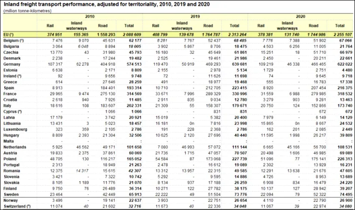 În anul 2010, în UE volumul transportului de marfă s-a ridicat la 2 088 miliarde de tone-kilometru, împărțit astfel: 1558 de miliarde de tone-kilometru pe șosele (74,6% din total), 378 de miliarde de tone-kilometru pe calea ferată (18%) și 155 de miliarde de tone-kilometru pe ape interioare (7,4 %). După un deceniu de reforme și de prioritate a transportului feroviar, s-a ajuns ca, în anul de vârf al economiei europene, 2019 să avem următoarea distribuție a traficului de mărfuri transportate în interiorul Uniunii, la un total de 2313 miliarde de tone-kilometru: 1764 de miliarde de tone-kilometru pe șosele (76, 2% din total), 408,8 miliarde de tone-kilometru pe calea ferată (17,6%) și 139,6 miliarde pe apele interioare (6,2 % din total).