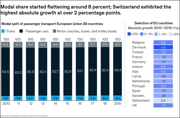 Adică s-a scremut un uriaș (ditamai Comisia Europeană) și-a născut un șoricel: creșterea cu aproape un punct procentual a ponderii traficului de călători pe continent. Dar poate cineva crede că această mică creștere este rodul vreunei politici înțelepte dusă de comisarii europeni. Nici gând, este mai degrabă vorba de creșterea gradului de urbanizare în UE, de la 70% în anul 2000 la peste 75% în 2020 și creșterea traficului de pasageri la metrou și la trenuri suburbane!