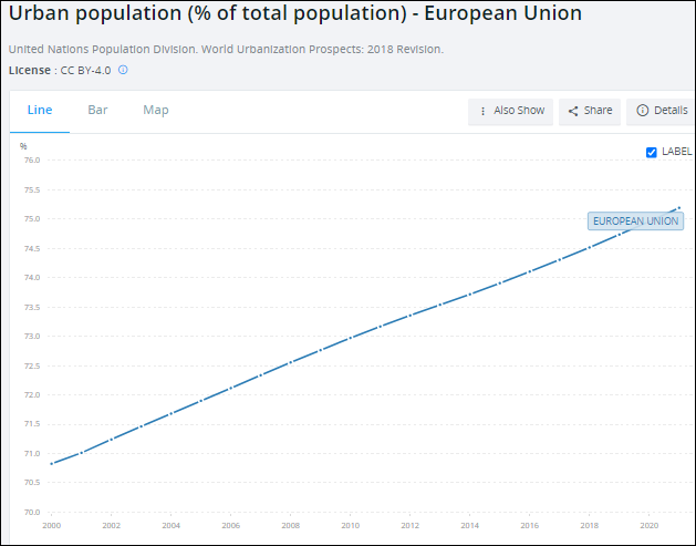 Sursa: https://data.worldbank.org/indicator/SP.URB.TOTL.IN.ZS?end=2021&locations=EU&start=2000