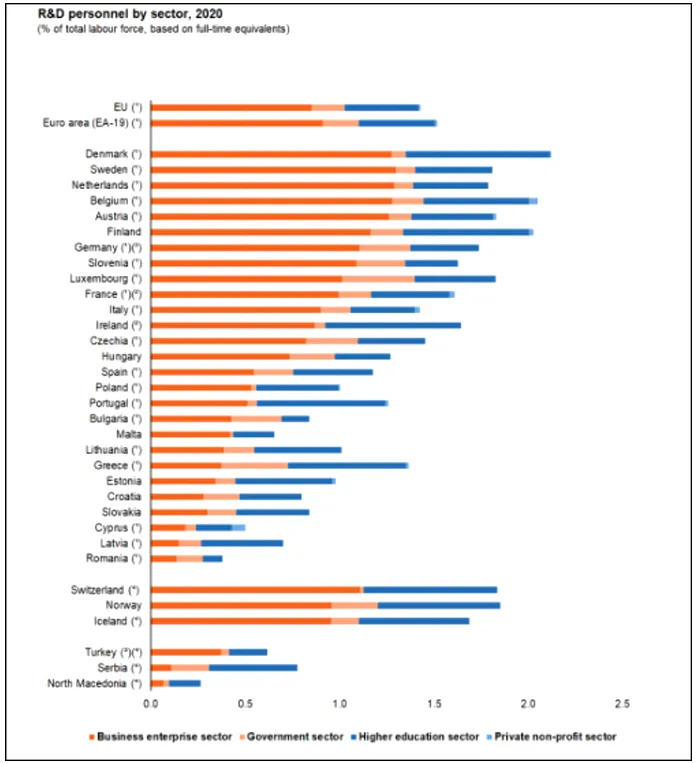 Suntem țara europeană cu cea mai mică pondere a angajaților din cercetare-dezvoltare, cam 0,4% din totalul salariaților. Dar și țara europeană cu cei mai puțini cercetători care lucrează în universități.