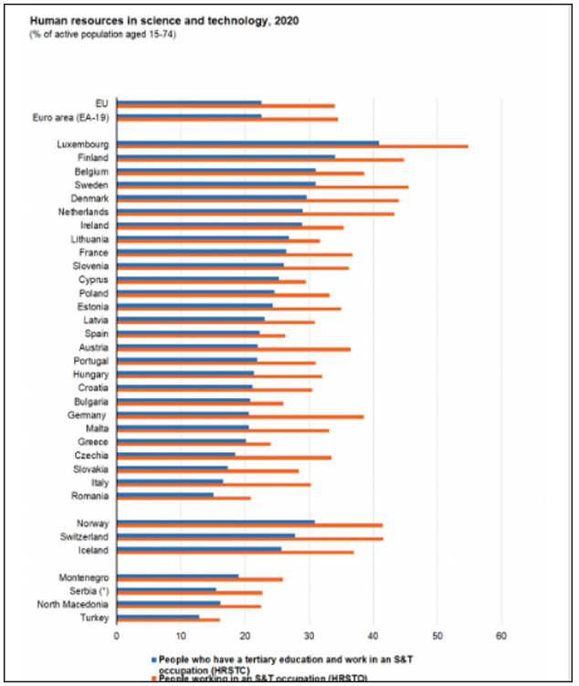 De altfel, suntem pe ultimul loc în Uniunea Europeană și în ceea ce privește rezervorul de „cadre”: doar 15% dintre românii care termină o facultate sunt în domeniul știință-tehnologie, HRST (human resources in science and technology) și doar 20% dintre cei care lucrează dintre absolvenții de facultate sunt în acest domeniu: