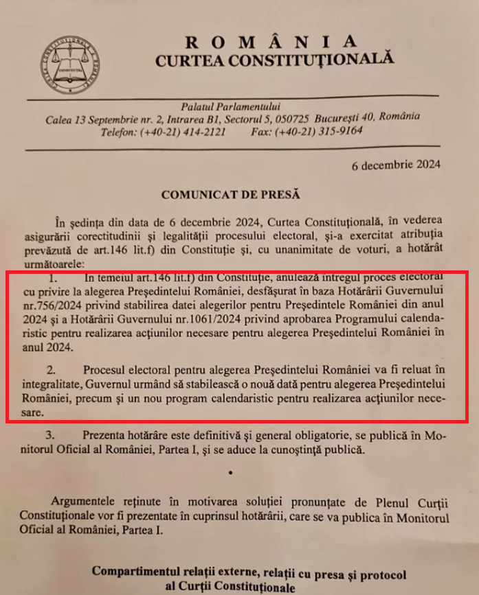 Mai mult, judecătorii CCR anunță în comunicatul de presă transmis în data de 6 decembrie 2025, că întregul proces electoral va fi reluat de la zero, în integralitatea sa.