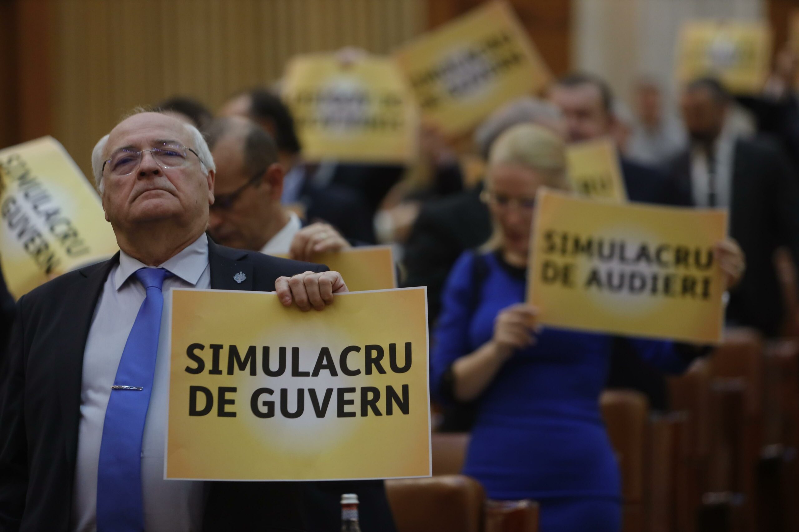 Aceștia au afișat pancarte pe care scria „Simulacru de audieri”, „Simulacru de Guvern”.