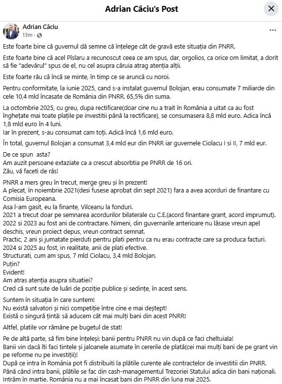Prima pagină » Știri politice » Adrian Câciu: În total, guvernul Bolojan a consumat 3,4 mld euro din PNRR, iar guvernele Ciolacu I și II, 7 mld euro