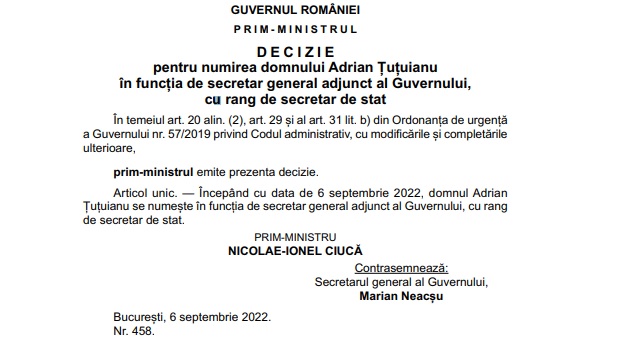 Premierul Nicolae Ciucă l-a numit, marți, pe Adrian Țuțuianu în funcția de secretar general adjunct al Guvernului, cu rang de secretar de stat, potrivit unei decizii publicate în Monitorul Oficial.