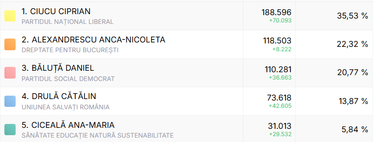 Potrivit rezultatelor de la ora 23:20, Ciprian Ciucu se menține pe primul loc cu 35%, urmat de Anca Alexandrescu 22% și de Daniel Băluță cu 17%.