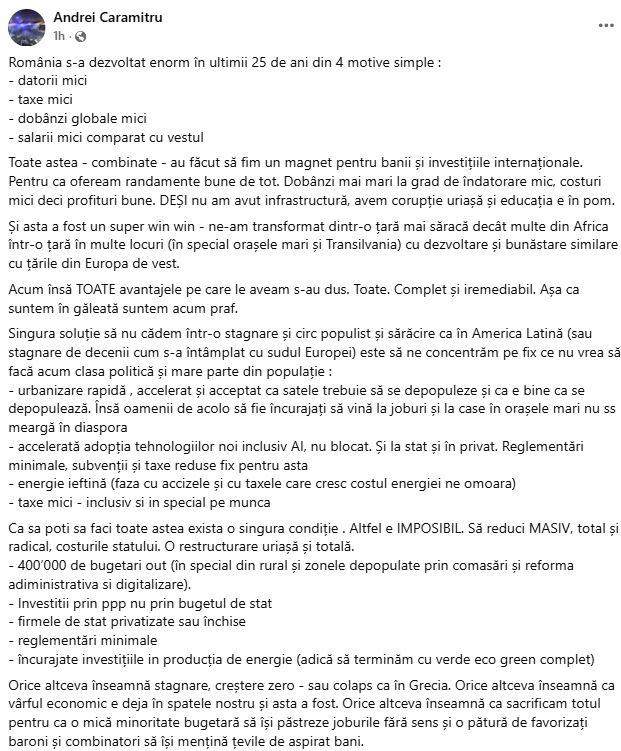 Orice altceva înseamnă stagnare, creștere zero – sau colaps ca în Grecia. Orice altceva înseamnă că vârful economic e deja în spatele nostru și asta a fost. Orice altceva înseamnă ca sacrificam totul pentru ca o mică minoritate bugetară să își păstreze joburile fără sens și o pătură de favorizați baroni și combinatori să își mențină țevile de aspirat bani”, a scris Andrei Caramitru pe Facebook.