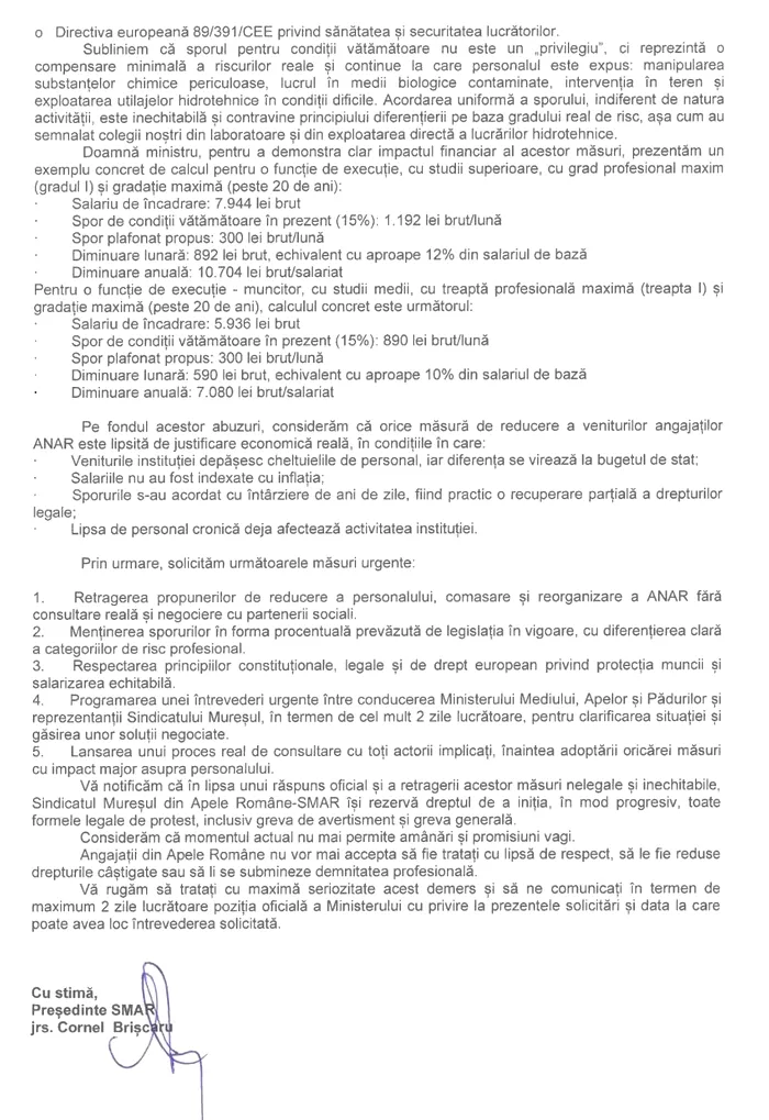 „În numele Sindicatului Mureșul din Apele Române-SMAR, sindicat reprezentativ la nivelul grupului de unități Administrația Națională Apele Române(#ANAR), sindicat care are în componența sa peste 30 la sută din numărul total de angajați ai acestei instituții la nivel național, am transmis Ministrului Mediului, Apelor și Pădurilor protestul nostru ferm și opoziția categorică față de intențiile Ministerului Mediului, Apelor și Pădurilor și guvernului de a promova măsuri care riscă să genereze efecte ireparabile asupra salariaților și a funcționării Administrației Naționale „Apele Române” (ANAR).”, anunță sindicaliștii.