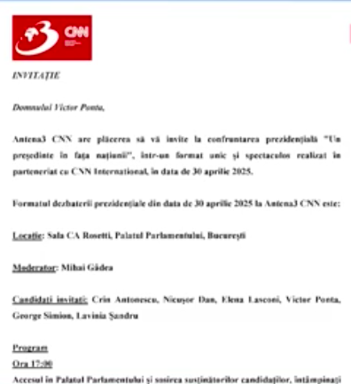 Publicarea invitației a venit după ce candidatul a afirmat în timpul dezbaterii de la TVR că nu a fost invitat de către Antena 3 CNN la emisiune.