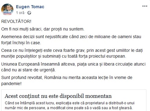 Europarlamentarul Eugen Tomac a reacționat pe Facebook la această situație: „REVOLTĂTOR! Om fi noi mulți săraci, dar proști nu suntem. Asemenea decizii sunt nejustificate când zeci de milioane de oameni stau forțat închiși în case. Ceea ce nu înțelegeți este ceva foarte grav, prin acest gest umilitor le dați muniție populiștilor și subminați cu toată forța proiectul european. Uniunea Europeană înseamnă altceva, piața unică și libera circulație atunci când nu ai stare de urgență”.