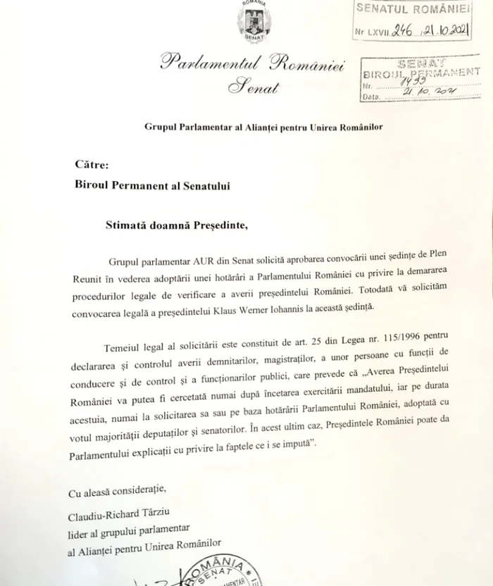 Inițial, cererea fusese depusă la Biroul Permanent al Senatului, care a trimis documentul Birourilor Permanente Reunite. Astfel, în ședința BPR cei din AUR au cerut suplimentarea ordinii de zi cu o cerere depusă de liderul grupului AUR, Claudiu Târziu, pentru demararea unor proceduri de verificare a averii președintelui.