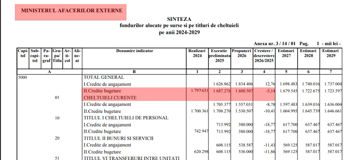 Singura instituție din această zonă care pierde bani este Ministerul Afacerilor Externe. Bugetul scade ușor, de la 1,68 miliarde lei la 1,60 miliarde lei, adică o reducere de 5,14%.