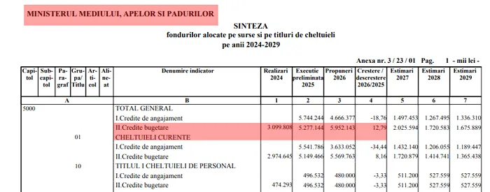 Bugetul Ministerului Mediului crește și el, de la 5,27 miliarde lei la 5,95 miliarde lei, adică o majorare de 12,79%.
