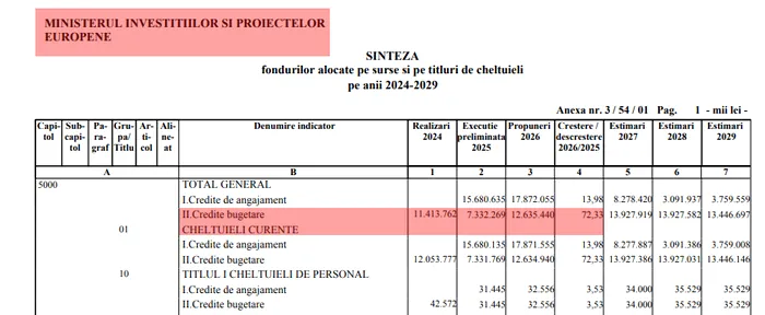 Cea mai mare creștere procentuală apare la Ministerul Investițiilor și Proiectelor Europene, care ajunge la 12,63 miliarde de lei, în creștere cu 72,33% față de cele 7,33 miliarde de lei din anul anterior. Creșterea reflectă în principal accentul pus de guvern pe absorbția fondurilor europene și pe finanțarea proiectelor de infrastructură și dezvoltare.