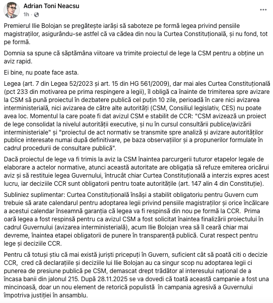Pentru că totuși știu că mai există juriști pricepuți în Guvern, suficient cât să poată citi o decizie CCR, cred că declarațiile și deciziile lui Ilie Bolojan au ca singur scop nu adoptarea legii ci punerea de presiune publică pe CSM, demascat drept trădător al interesului național de a încasa banii din jalonul 215. După 28.11.2025 se va dovedi că toată această campanie a fost una mincinoasă, doar un nou element de retorică populistă în campania agresivă a Guvernului împotriva justiției în ansamblu”, scrie Toni Neacșu pe Facebook.
