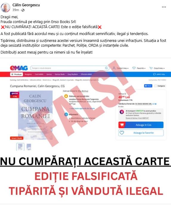 De data aceasta, a susținut că „frauda continuă”, cartea fiind disponibile către vânzare pe o platformă comercială. Fostul candidat la prezidențiale i-a avertizat pe urmăritori să nu achiziționeze cartea care se află disponibilă pe internet. În plus, a mai menționat că situația a fost sesizată către instituțiile competente. Iată mesajul transmis pe Facebook.