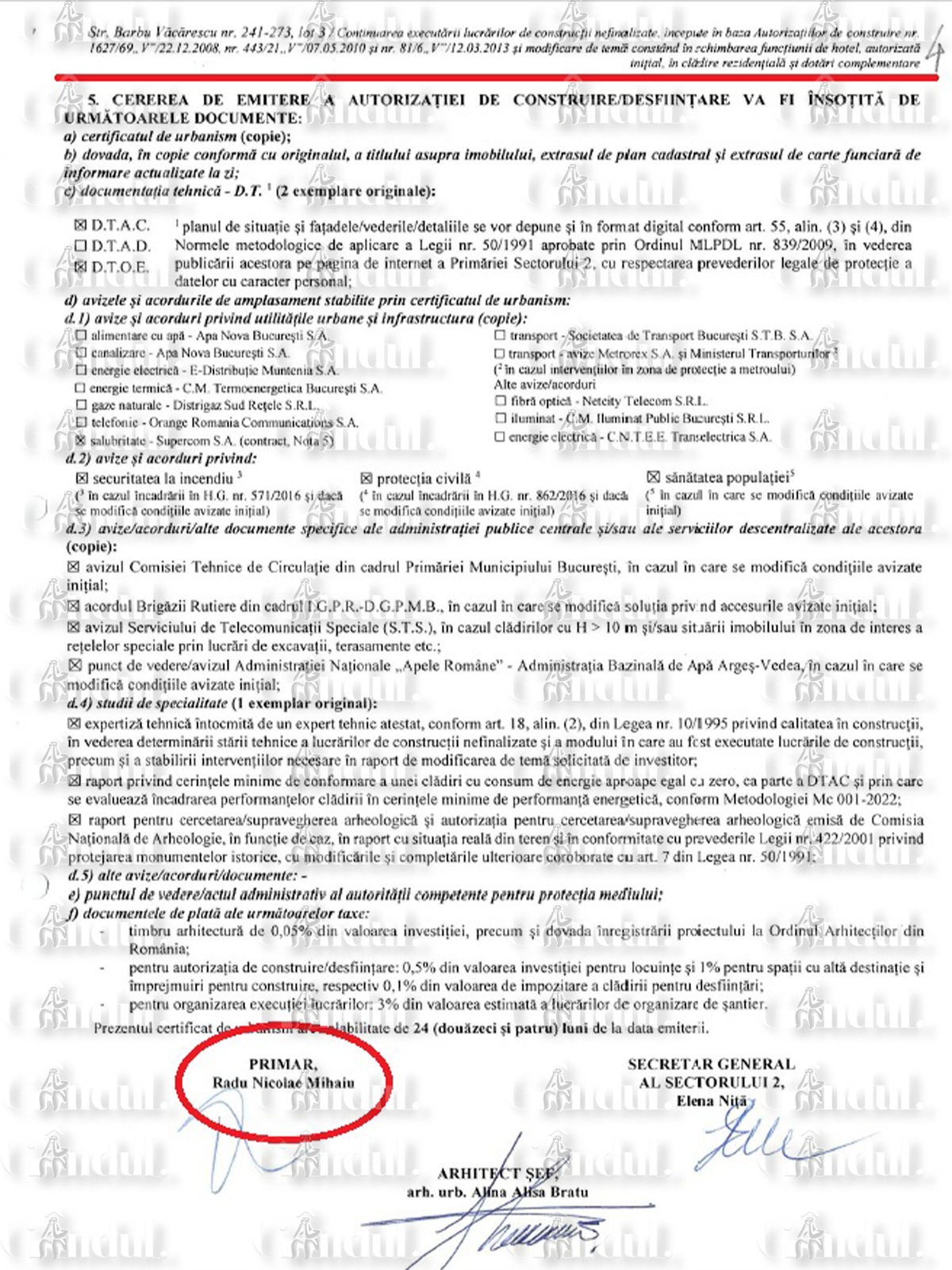 avizul Serviciului de Telecomunicații Speciale (S.T.S.), în cazul clădirilor cu H> 10 m şi/sau situării imobilului în zona de interes a rețelelor speciale prin lucrări de excavații, terasamente etc.;”, se arată în Certificatul de Urbanism, semnat de Radu Mihaiu în 2023 și intrat în posesia de Gândul.