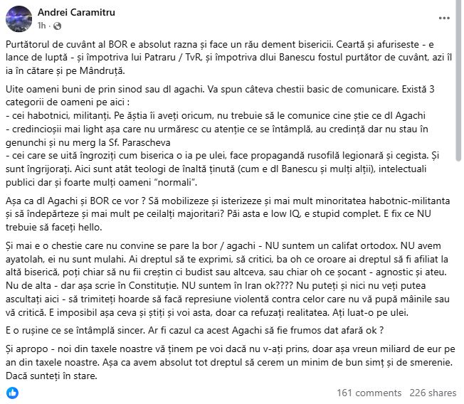 Andrei Caramitru cere demiterea purtătorului de cuvânt al Bisericii Ortodoxe Române (BOR), Adrian Agachi. Într-o postare pe Facebook, Caramitru susține că acesta ar „face un rău bisericii” și că ar fi „absolut razna”.