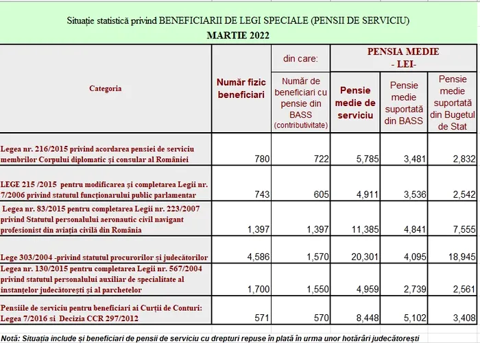 Conform statisticilor Casei Naționale de Pensii Publice, pentru luna martie 2022, sunt șase categorii de beneficiari de legi speciale (pensii de serviciu) care au primit o pensie medie de serviciu cuprinsă între 4.911 și 20.301 lei.
