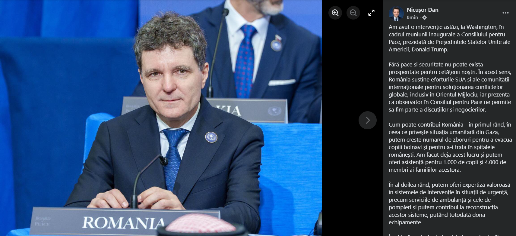 „Am avut o intervenție astăzi, la Washington, în cadrul reuniunii inaugurale a Consiliului pentru Pace, prezidată de Președintele Statelor Unite ale Americii, Donald Trump.