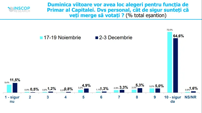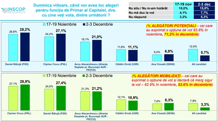 Dintre cei care merg sigur la vot (adică 52.6% din total eșantion), 28.9% l-ar vota pe Ciprian Ciucu (PNL) ca Primar General al Municipiului București (față de 27.1% în noiembrie), 27.4% pe Daniel Băluță (PSD) (față de 24% în noiembrie), iar 21.2% pe Anca Alexandrescu (independentă, susținută de AUR și PNȚCD) (față de 21.3% în noiembrie). 10.9% dintre bucureșteni l-ar alege pe Cătălin Drulă (USR) (față de 12.1% în noiembrie), iar 8.3% pe Ana Ciceală (SENS) (față de 7.6% în noiembrie). 3.3% indică un alt candidat (față de 7.9% în noiembrie).