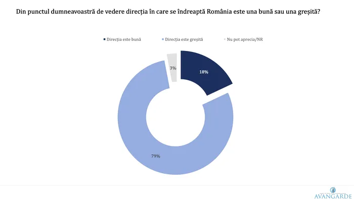 Rezultatele arată o stare generală de îngrijorare: aproape 8 din 10 români (79%) consideră că țara se îndreaptă într-o direcție greșită, în timp ce doar 18% cred că direcția este una bună.
