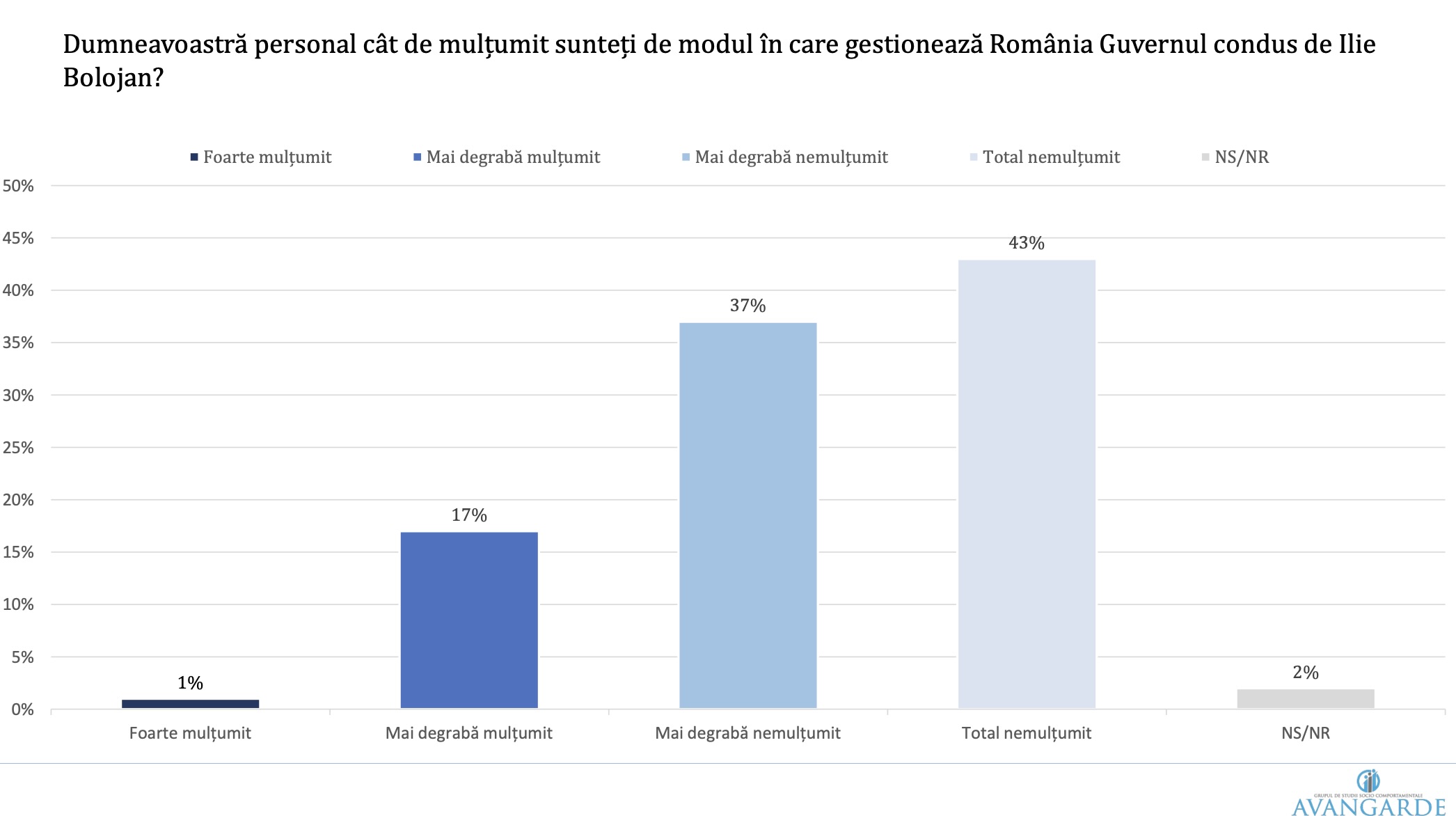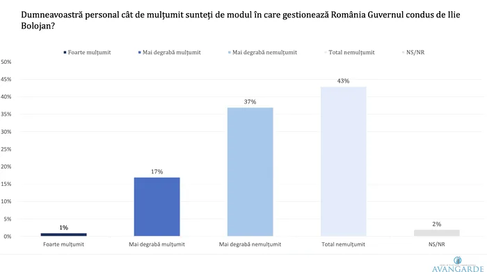 Un sondaj realizat de Avangarde între 10 și 17 martie 2026 arată o stare accentuată de nemulțumire în rândul populației. Percepția asupra direcției țării este puternic negativă, iar evaluările asupra Guvernului Bolojan, în mare parte, critice.