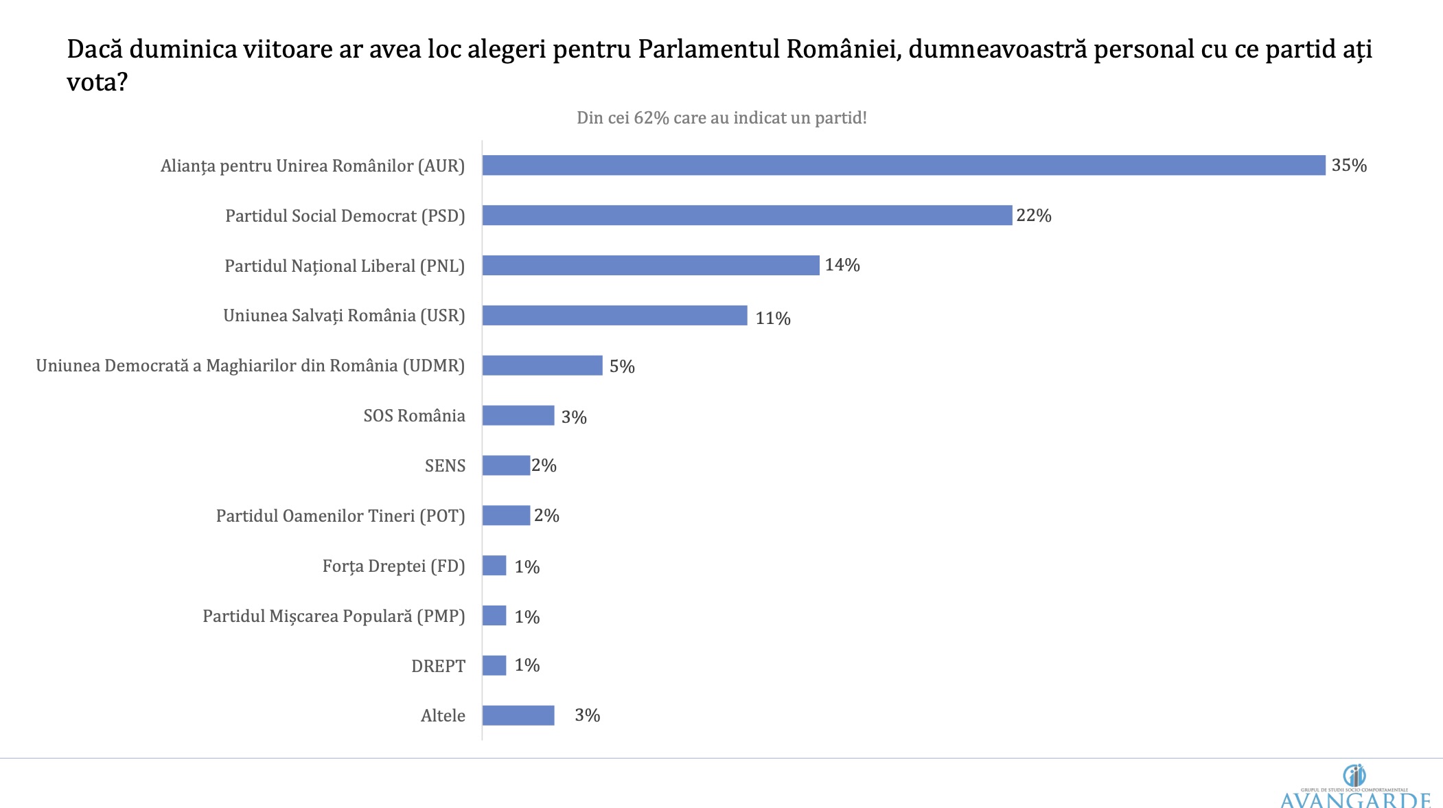 Dacă duminica viitoare ar avea loc alegeri parlamentare, sondajul indică un avans clar pentru AUR, cotat la 35% din intențiile de vot.