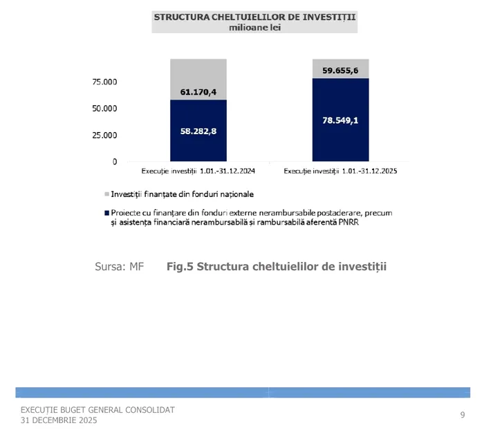 Date oficiale Ministerul de Finanțe 31 dec 2025: Investiții totale efectuate în 2025 = 138,2 miliarde lei, din care Investiții finanțate din buget 59,7 miliarde lei și investiții finanțate din fonduri europene 78,5 miliarde lei (vedeți foto 2)! https://mfinante.gov.ro/…/executii/nota_bgc31122025.pdf