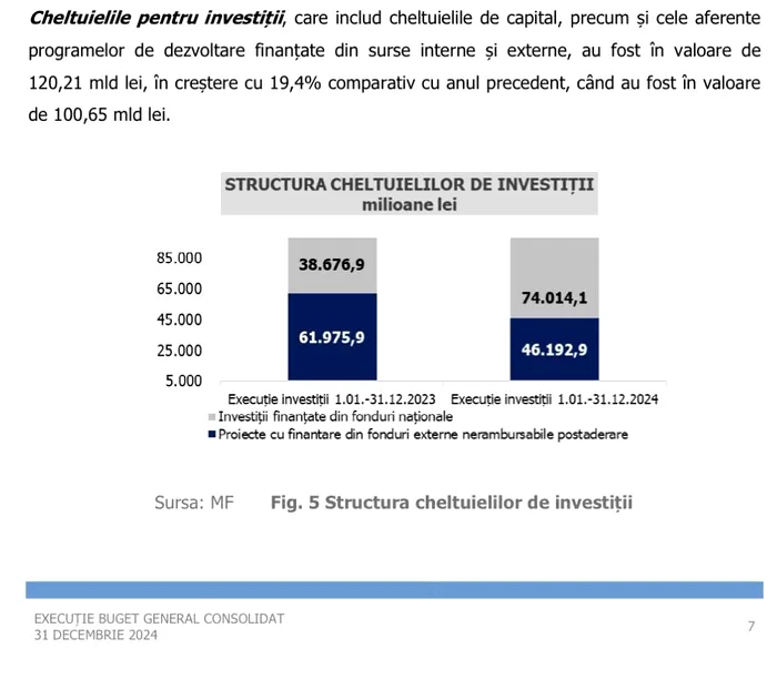 Date oficiale Ministerul de Finanțe 31 dec 2024: Investiții totale efectuate = 120,2 miliarde lei, din care Investiții finanțate din buget 74 miliarde lei și investiții finanțate din fonduri europene 46,2 miliarde lei (vedeți foto 1) https://mfinante.gov.ro/…/executii/nota_bgc31122024.pdf