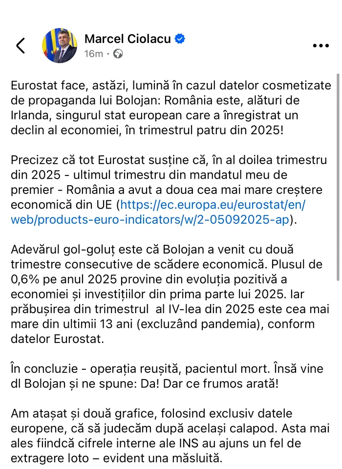 Într-o postare publică, Marcel Ciolacu susține că cifrele oficiale prezentate de Eurostat ar contrazice mesajele optimiste promovate de actuala guvernare. Acesta afirmă că România ar fi înregistrat o contracție economică semnificativă în ultimul trimestru din 2025.