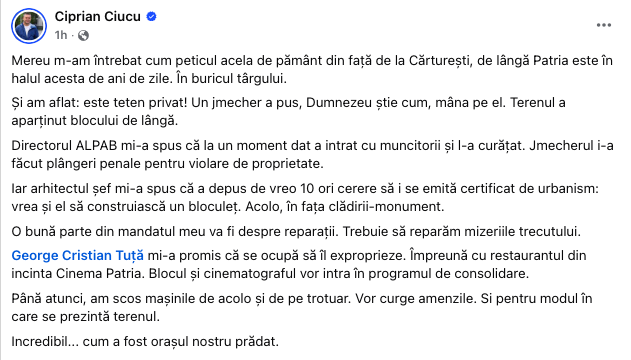 Ciucu susține că situația actuală nu este una normală și că proprietatea a ajuns în mâinile „unui șmecher”.