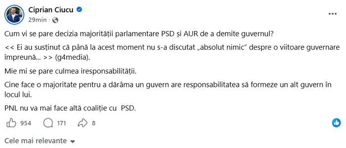 Ciprian Ciucu a comentat public mișcarea politică și a pus sub semnul întrebării logica unei majorități care inițiază demiterea unui guvern fără a oferi o alternativă clară.