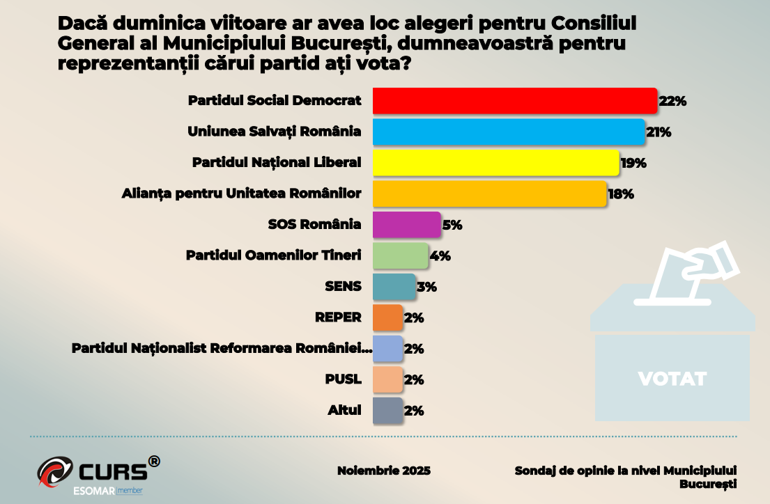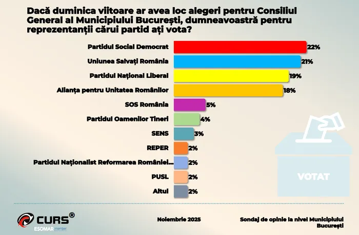 PSD este la 22% în sondajul CURS, urmat foarte aproape de USR, cu 21% și de PNL, cu 19%. AUR este creditat cu 18%, iar restul partidelor sunt situate între 2% și 5%.