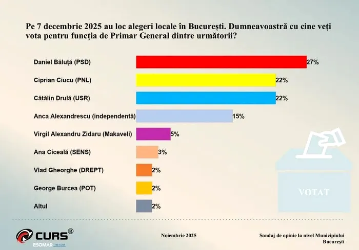 Primarul PSD al Sectorului 4, Daniel Băluță, se menține pe prima poziție în cursa pentru Primăria Capitalei, relevă datele ultimului Sondaj CURS realizat în perioada 3 – 14 noiembrie. Urmează, la egalitate, Cătălin Drulă (USR) și Ciprian Ciucu (PNL), cu câte 22%.
