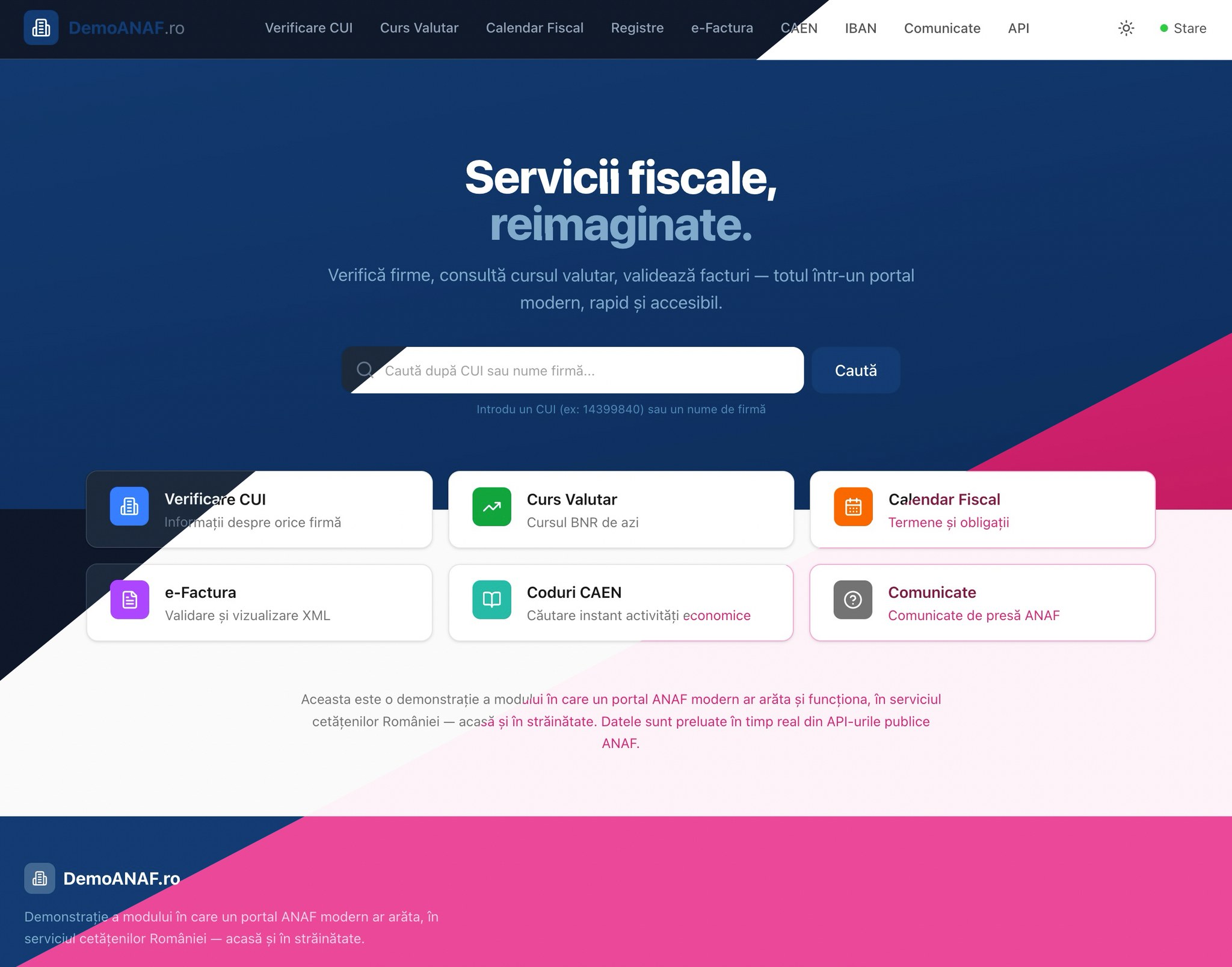 demoanaf.ro ia exact aceleași date publice (API-urile ANAF, BNR) și le servește într-o interfață modernă, rapidă și accesibilă. Verificare CUI, curs valutar, calendar fiscal, validare e-Factura, coduri CAEN, IBAN-uri trezorerie — totul sub 2 secunde”, a argumentat IT-istul.