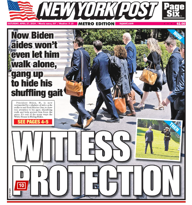 Una dintre imagini cu Biden flancat a ajuns pe coperta New York Post, din 27 aprilie 2024.