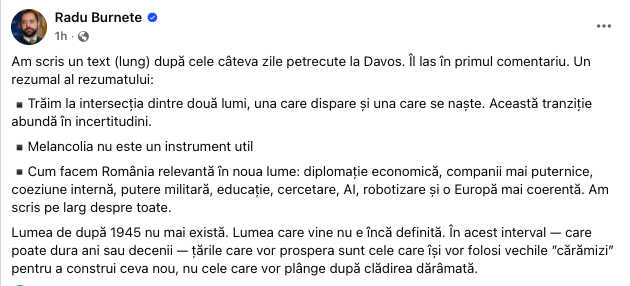 „Am fost la Davos o echipă de trei miniștri din trei partide diferite și un consilier prezidențial (fără apartenență politică) și nu s-a simțit deloc tensiunea din țară. (…) Recunosc: Davos a fost ușor — un mediu controlat, internațional și fără presiunile politice de acasă” a scris Burnete.