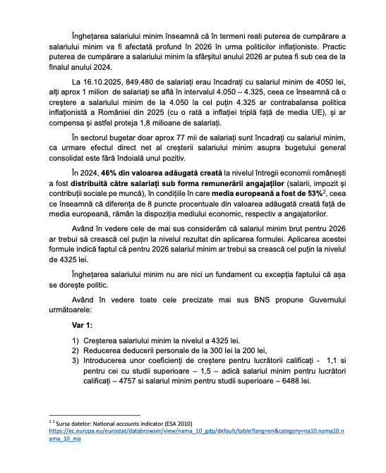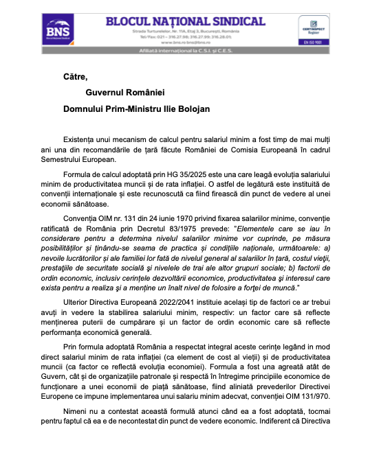 BNS i-a trimis miercuri lui Bolojan o scrisoare în care aceștia că „o decizie de înghețare a salariului minim în 2026 nu are nici un fel de fundament economic si social.”