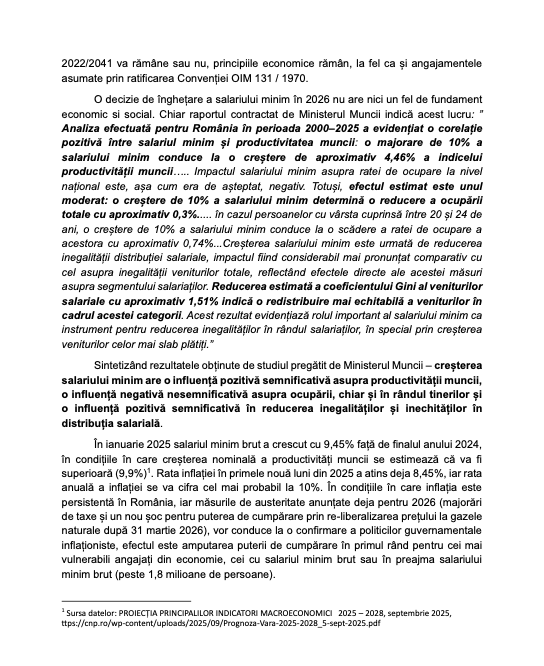 „Organizația noastră subliniază cu fermitate că salariul minim reprezintă nu doar un indicator economic, ci o măsură socială de protecție a muncii decente, un instrument de coeziune și un barometru al respectului față de cetățeanul care muncește. În consecință, stabilirea nivelului pentru 2026 trebuie să reflecte nu doar datele macroeconomice, ci și realitatea dură a vieții de zi cu zi, marcată de inflație, creșterea prețurilor la alimente și utilități și scăderea puterii reale de cumpărare”, precizează reprezentanții sindicatului, potrivit Agerpres.
