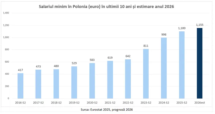 A implementat creșteri accelerate în ultimii 3 ani, cu majorări bianuale. De fapt, evoluția salariului minim în Polonia indică două perioade specifice: una de creștere graduală (2016-2022, agregat plus 53%) și cealaltă de creștere accelerată (2023-2025, agregat plus 72%). În anul 2024, salariul minim în Polonia a depășit 60% din salariul mediu. În ultimii 10 ani, salariul minim în Polonia a crescut cu 164%. Guvernul a propus pentru 2026 un nivel de 1.140 euro (+3,6%), sindicatele solicitând o creștere mai mare, de 5%. Probabilitatea de a ajunge la un compromis de creștere cu 5% (la 1155 euro lunar) de la 1 ianuarie 2026 este ridicată. De observat că Polonia a atins un echivalent al salariului minim de circa 1.000 euro în 2024.