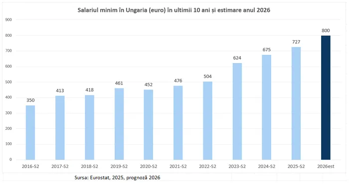 Analog situației din Polonia, vecinii noștri au crescut accelerat salariul minim brut în ultimii ani. După ce în 7 ani (perioada 2016-2022) salariul minim brut a crescut cu 44%, în ultimii 3 ani (2023-2025), acest indicator a avut aceeași dinamică pozitivă consistentă, plus 44%, de la 504 euro la 727 euro. În ultimii 10 ani, salariul minim în Ungaria s-a dublat (plus 108%), ajungând de la 350 euro în 2016 la 727 euro în prezent. De observat că la indicatorul Salariul minim brut exprimat în euro, România a depășit Ungaria începând cu anul 2022! Pentru 2026, valoarea salariului minim brut nu este stabilită official. Însă, dacă se respectă acordul pe 3 ani semnat în 2024, înseamnă că salariul minim brut în euro va crește în 2026 cu 10%, până la 800 euro.